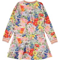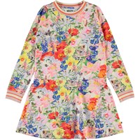 Conny is a blue dress in the 'Hide and Seek' print that shows different animals hiding in the flowers. It has long sleeves and striped rib at the neck and sleeves.