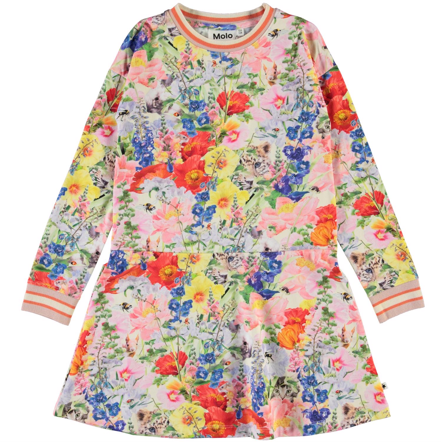 Conny is a blue dress in the 'Hide and Seek' print that shows different animals hiding in the flowers. It has long sleeves and striped rib at the neck and sleeves.