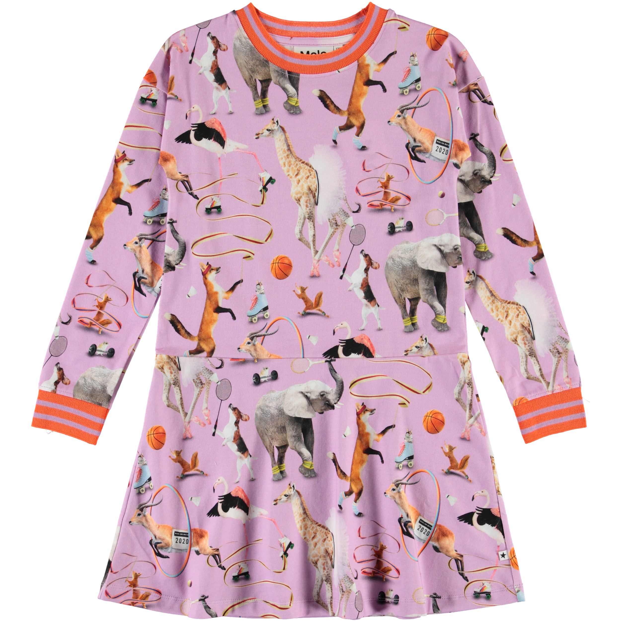 Conny is a light purple dress with a print of animals engaged in various sports. The dress has long sleeves and a striped rib edge at the neck and sleeves.