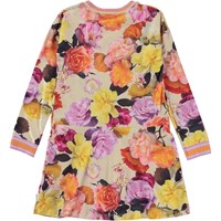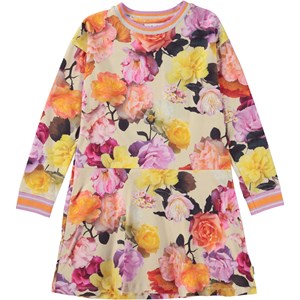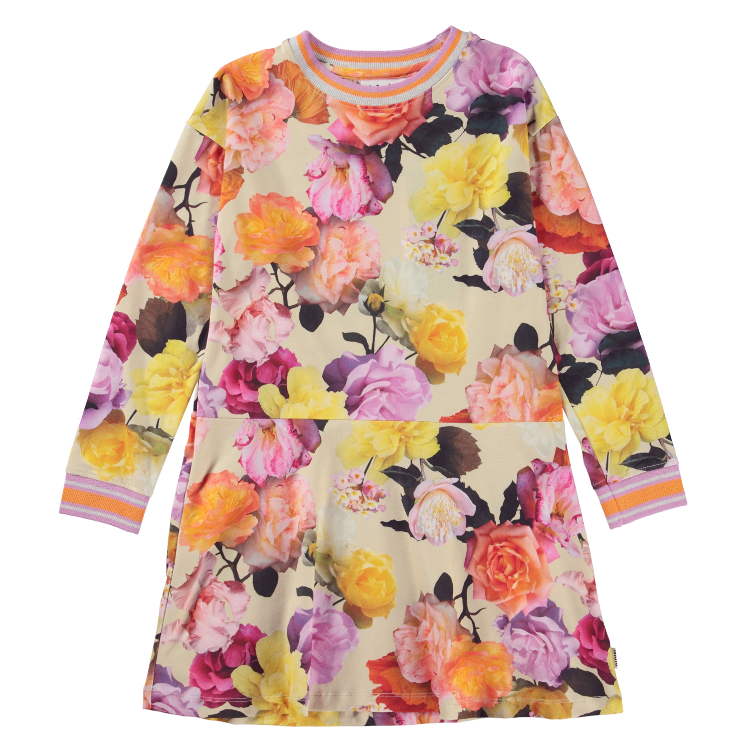 Conny is a long sleeve jersey dress in organic cotton. The dress has striped rib at the neck and sleeves in light grey, orange and purple. The dress has a seam at the hips and is in the all over Rose Garden print, which depicts all the garden roses in all sorts of colours.