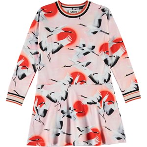 Conny is a rose coloured dress with a flying crane print. The dress has long sleeves and a striped rib edge at the neck and sleeves.