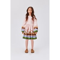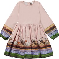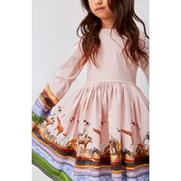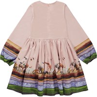 Cordelle is a pink dress with stretch in organic cotton. The dress has long sleeves with elastic at the wrists. It has an airy, circular skirt. The bottom of the dress and sleeves shows different natural elements and animals from various parts of the world, printed in wide stripes. The dress has a concealed back zip closure.