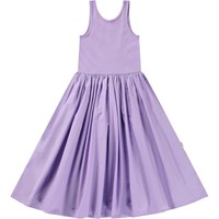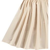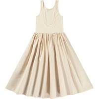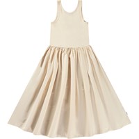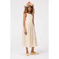 Beige dress in organic cotton with a voluminous poplin skirt. The top of the dress is fitted with a round neck, a deep back, and is sleeveless.