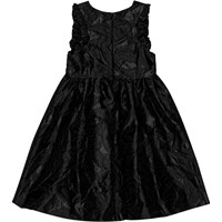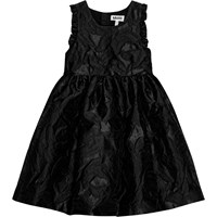 Black knee-length dress in a jacquard weave. The dress has a loose fit and a round neckline and is sleeveless but adorned with a delicate ruffle edge and an invisible zipper at the back. The voluminous silhouette and the fine leaves woven into the material add a sophisticated and luxurious touch to the dress. Combine with a matching jacket to complete the set.