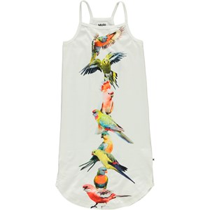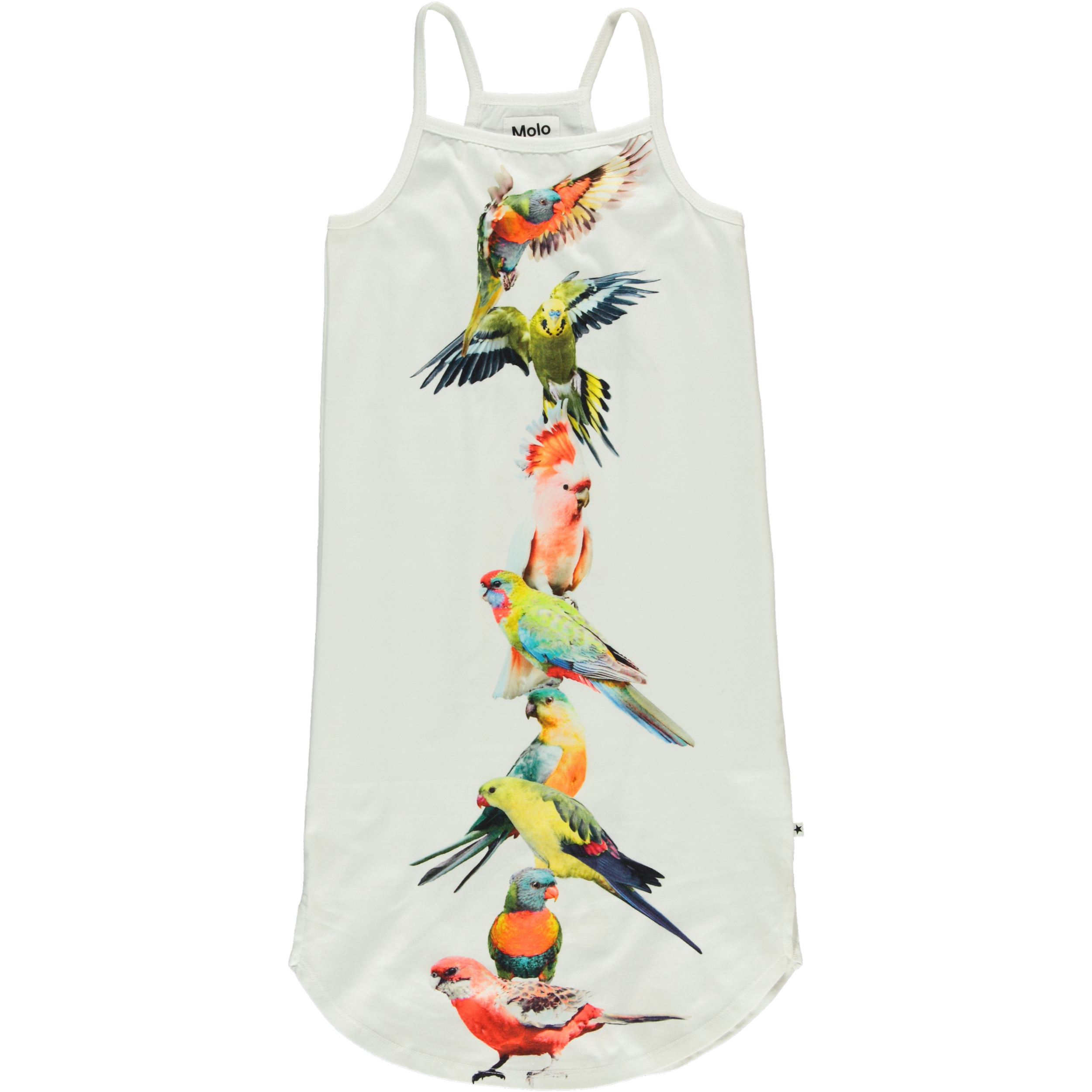 The Cortney strap dress has colourful parrots on top of each other on the front. Fly out in the summer with all the parrots wearing the Cortney dress.
