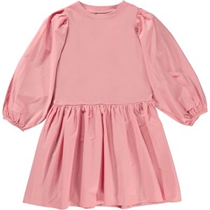 Pink, knee length dress with poplin sleeves and skirt. This dress is in 100% cotton, has a round neck with a rib edge, long full sleeves with elastic and a gathered skirt with plenty of movement. It is in a regular fit.