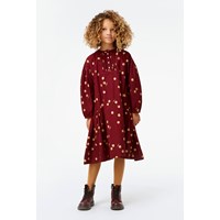 Cosimo is a bordeaux dress with yellow polka dots. The dress is in a slightly oversized fit, has long sleeves and a button closure at the collar.