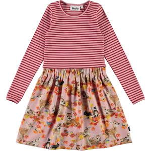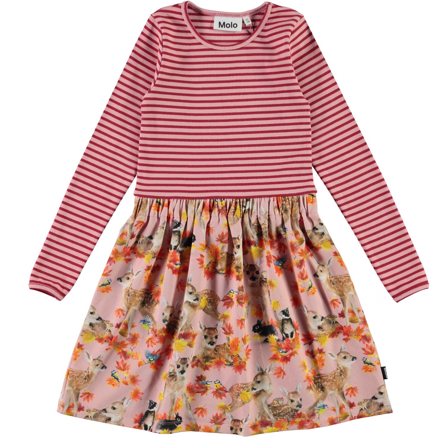 Credence is a long sleeve dress in two parts: The top is in pink and red striped rib. The skirt is pink with a print of deer, rabbits and golden leaves.
