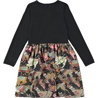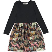 Black, knee length dress in a solid black top and in an all over llama print on the skirt. The humourous print shows two llamas that are wearing Molo's own knits, and they are all bundled up in hats, infinity scarves and jumpers. This dress is in 100% cotton, has a round neck, long sleeves, sewn on skirt with a print and is in a regular fit.