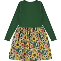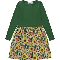 Green, knee length dress with a solid green top and with an all over floral print on the skirt. The print is of a lot of different flowers like sunflowers and Dahlias in shades of pink and yellow. This dress is in 100% cotton, has a round neck, long sleeves, sewn on skirt with a print and is in a regular fit.