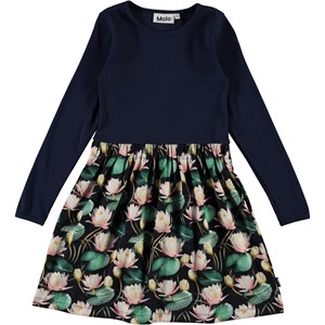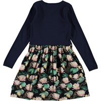 Credence is a long sleeve dress in two parts: It has a dark blue rib top. The skirt is in a print of pink water lilies.