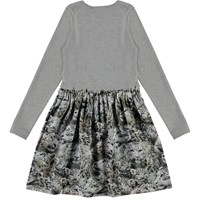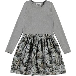 Credence is a long sleeve dress in two parts: It has a grey rib top. The skirt is in   a print of beautiful snow leopards.