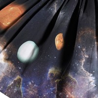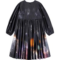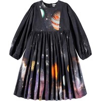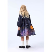 Knee-length black dress made of organic cotton with a round neck and long sleeves, which have elastic around the cuffs. The top is designed with panels and the skirt has gathers that give the dress volume. The invisible zipper at the back makes it easy to put on. The dress is has a print of the universe and planets.