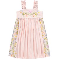 Pink knee-length dress with floral print made of soft viscose, which feels light and airy against the skin. The dress has a loose fit with wide ruffle straps and a concealed side zip, making it easy to put on and take off, as well as ensuring a good fit.