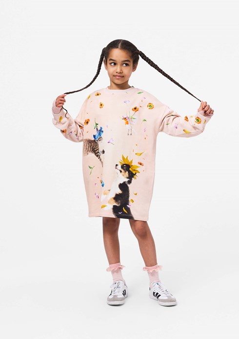 Pink jersey dress made of soft organic cotton with ribbed edges at the sleeves and neck. The dress is knee-length and has a loose fit with a front print of a cat, bird, and dog in a rain of colourful flowers.
