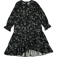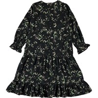 Cyrus is a dark dress with the floral 'Moonlight Garden' print. The dress has ruffles at the sleeves and bottom and a zip closure at the neck.