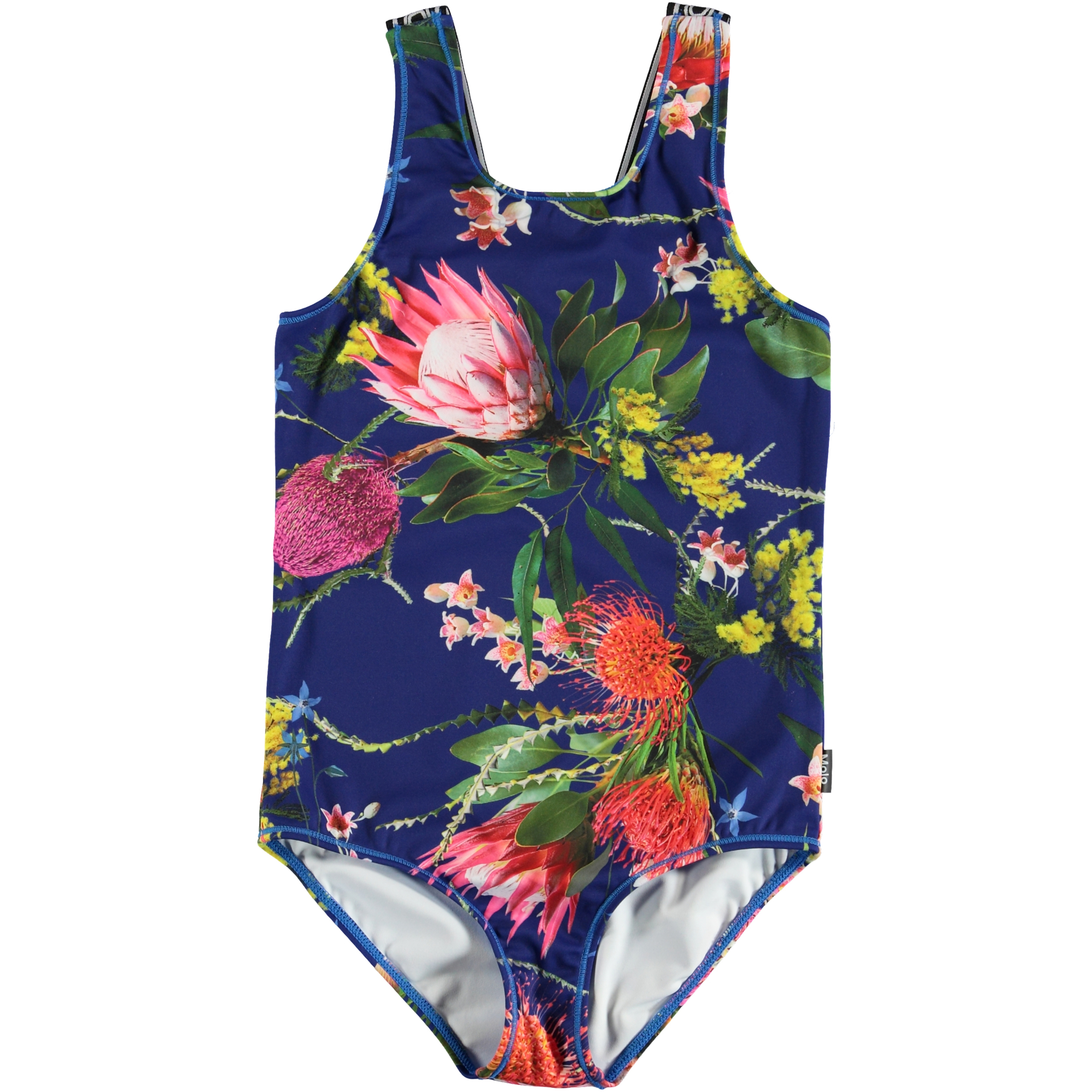 Orchid is a floral bodysuit in blue, which has wide straps with text. It is perfect for gymnastics or any other kind of activity where a snug-fitting top is an advantage. Orchid is a part of Molo's new sports collection, which seamlessly unites fashion and sports. The top is comfortable and constructed in technical wicking fabrics that transport moisture away from the body. Molo’s sports collection is made with a unique, high-performance technology called HeiQ Smart Temp, which supports the body’s natural ability to cool itself down. • The cooling function is activated when you are warm and sweating. • The cooling function becomes deactivated when the body has cooled down. • HeiQ Smart Temp ensures optimal performance and comfort. • Independently tested for skin safety. •
