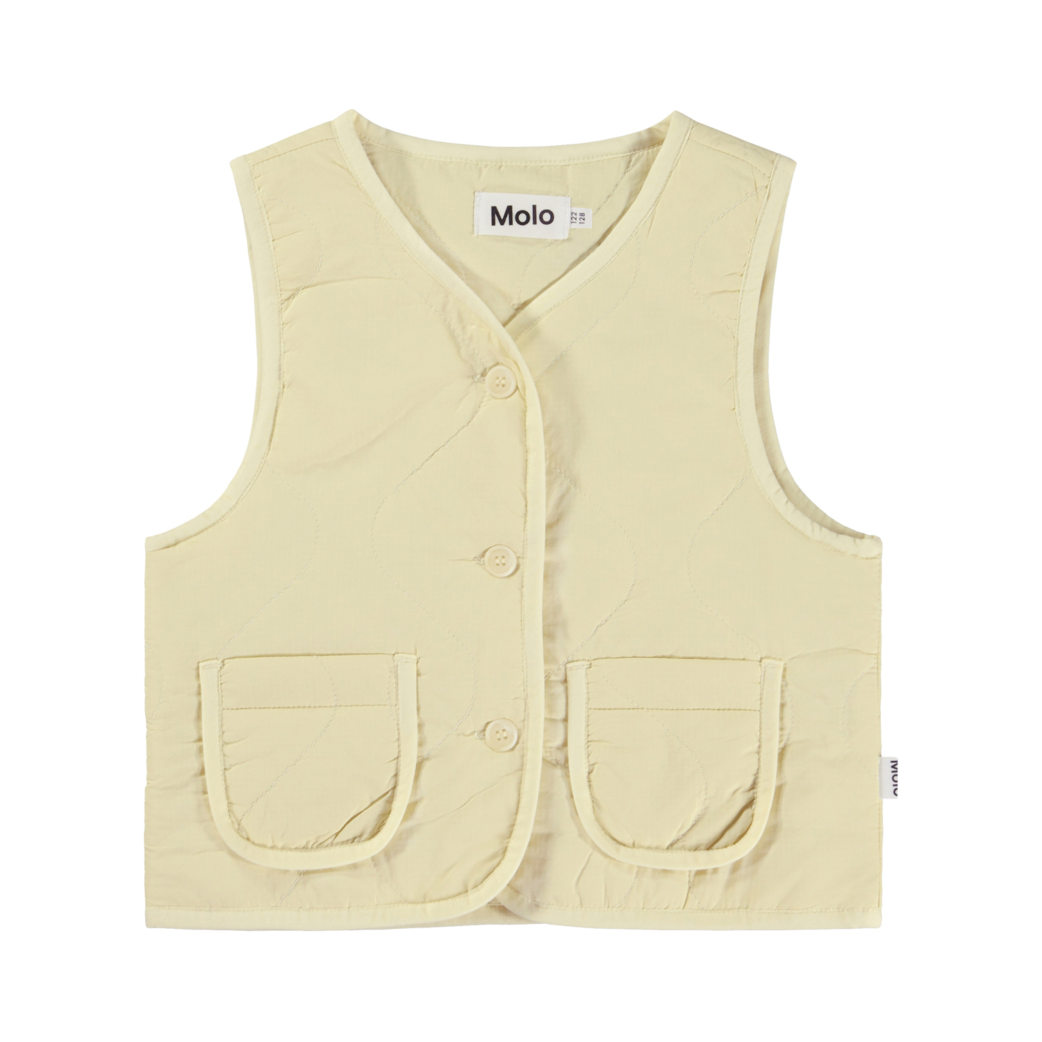 Light yellow quilted waistcoat with edge tape. It is in 100% nylon, has a V-neck, a button front closure, light yellow edge tape at the sides and on the patch pockets and is in a regular fit. Wear it with the matching Bette skirt in the same fabric and colour for a cool look.