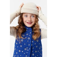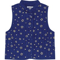 Navy quilted waistcoat in soft cotton with a Mandarin collar and large armholes. There is room for a jumper underneath. The waistcoat has a button closure at the front and small embroidered gold stars, which give it an exclusive look. Pair the waistcoat with a matching skirt to create an exclusive set.