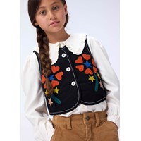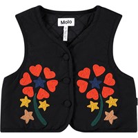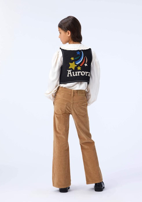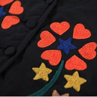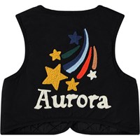 Short, lightly padded vest with button closure at the front. The vest is black with embroidered flowers on the front, shooting stars on the back and the text ''Aurora'' what gices a unique and decorative touch.