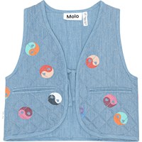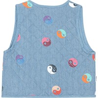 Blue denim, lined waistcoat in quilted cotton with small, welt pockets. It has a round neck, a button front closure and an edge tape at the armhole and all the edges to create a refined finish. Squares with multi-coloured yin/yang symbols form the beautiful quilting pattern on the waistcoat.