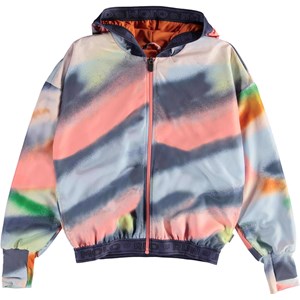 Ophelia is a roomy sports jacket with spray paint. The jacket has a zip closure and a hood as well as blue edge tape with text. The jacket is part of Molo's new sports collection, which helps integrate sports and fashion. Wear Ophelia with one of the matching styles from Molo's sports collection for a complete, cool look. Molo’s sports collection is created with a unique, high performance technology called HeiQ Smart Temp, which supports the body's own ability to cool down. The cool down function is activated when the body gets warm and sweaty, and then turns off when the body has cooled down. HeiQ Smart Temp ensures optimal comfort and performance. It has been independently tested to ensure that it is safe for the skin.
