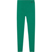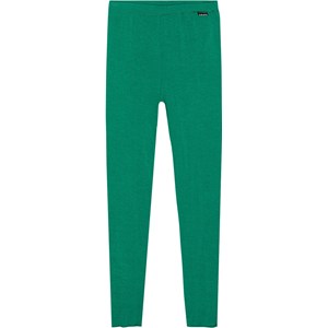 Green leggings in stretchy, soft viscose. They have an elastic waist and a small logo on the front with the words 'More love'. They are snug fitting, comfortable and easy to pull on.
