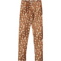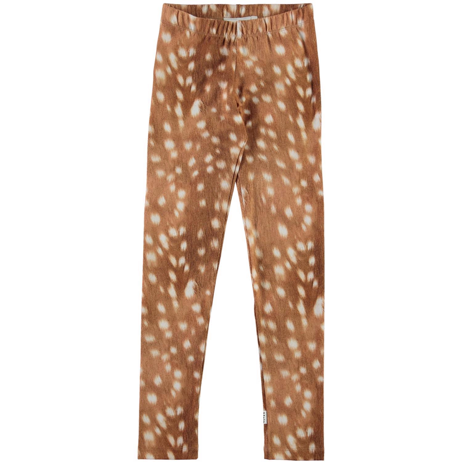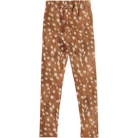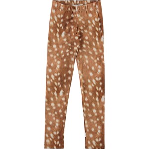 Molo's classic, long leggings in brown with white spots. They are constructed in a stretchy, cotton blend fabric with an elastic waist for a good fit.