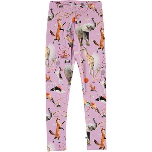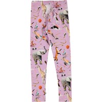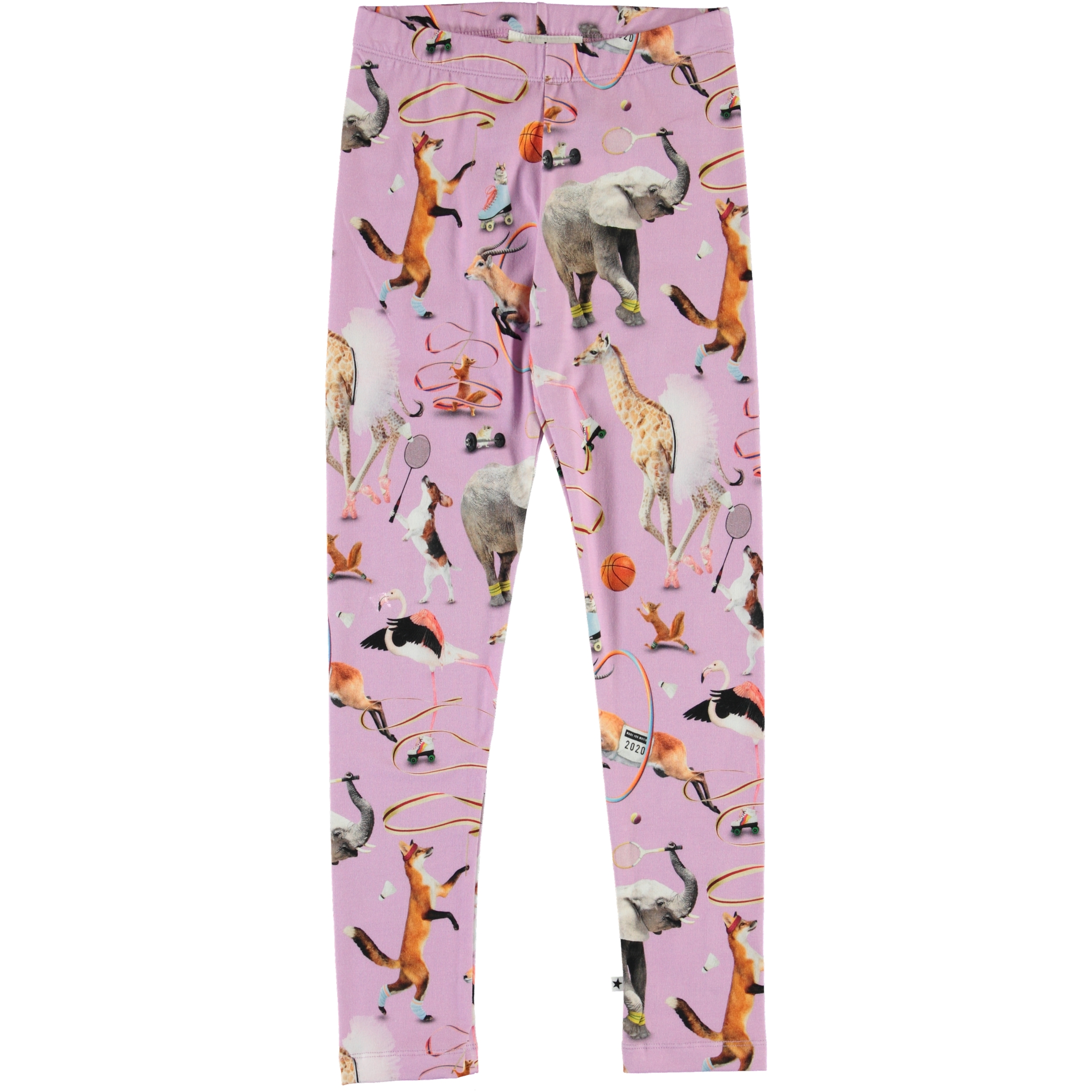Molo's classic, long leggings in purple with a print of various animals engaged in sports. They are constructed in a stretchy, cotton blend quality and the elastic waist ensures a good fit.