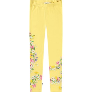 Yellow leggings in stretchy organic cotton with an elastic waistband. The soft leggings are snug-fitting with a print of colourful summer flowers and a bird.