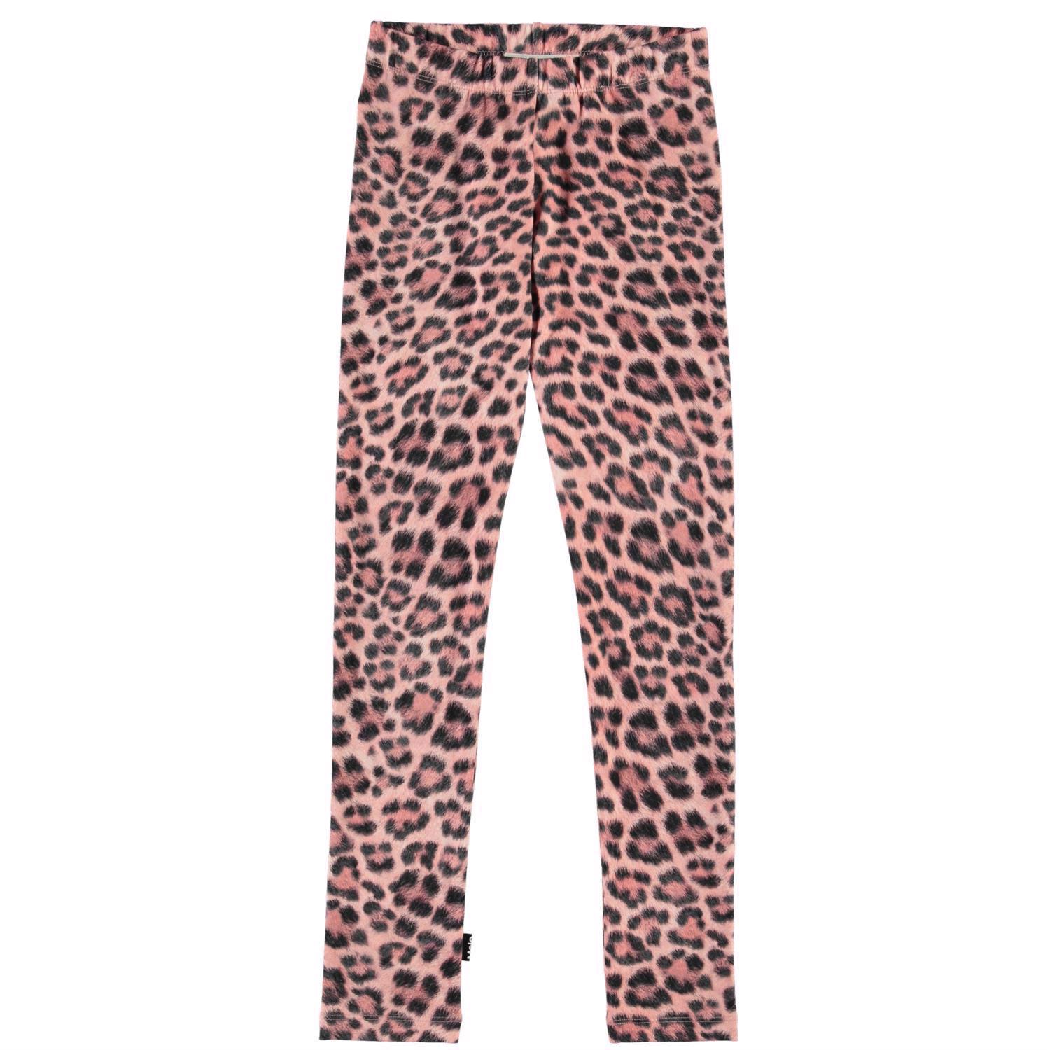 Molo's classic, long leggings in a pink leopard print. The leggings are constructed in a stretchy cotton blend, and they have an elastic waist for a good fit.