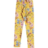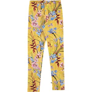 Molo's classic, long leggings in yellow with a floral print. They are constructed in a stretchy, cotton blend quality and the elastic waist ensures a good fit.
