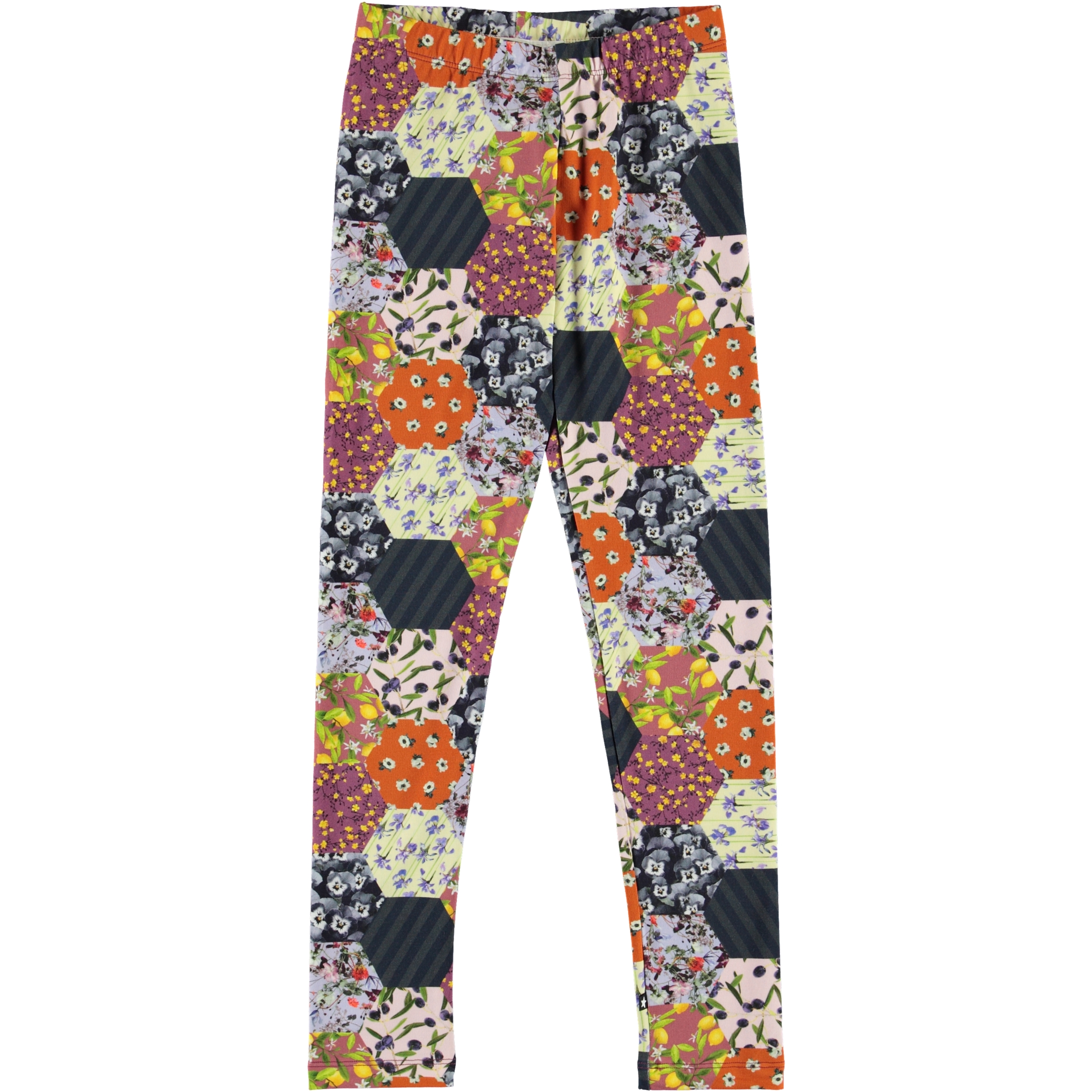 Molo's classic long leggings with a patchwork print. The leggings's stretchy, cotton blend fabric and elastic waist ensure a good fit.