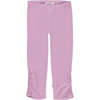Nila is a pair of pink trousers in organic jersey. The trousers have elastic at the waist and ruching at the side seams at the bottom of both legs.