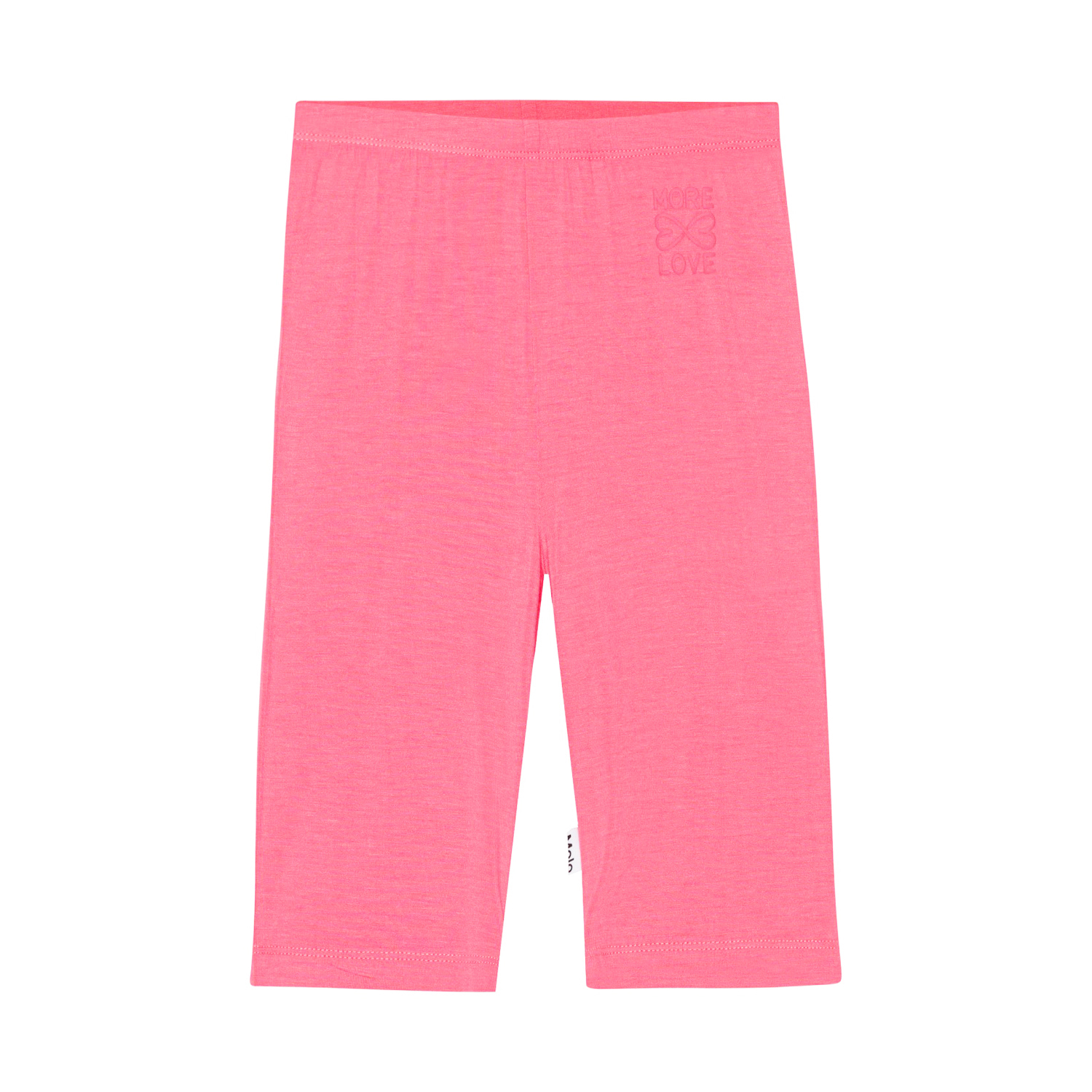 Pink bike shorts in soft, elastic viscose. The shorts are knee length and have an elastic waist and a small logo on the front with the text, 'More love'. They are snug fitting, comfortable and easy to pull on and off.