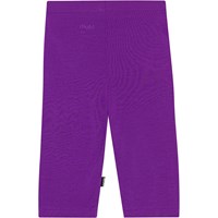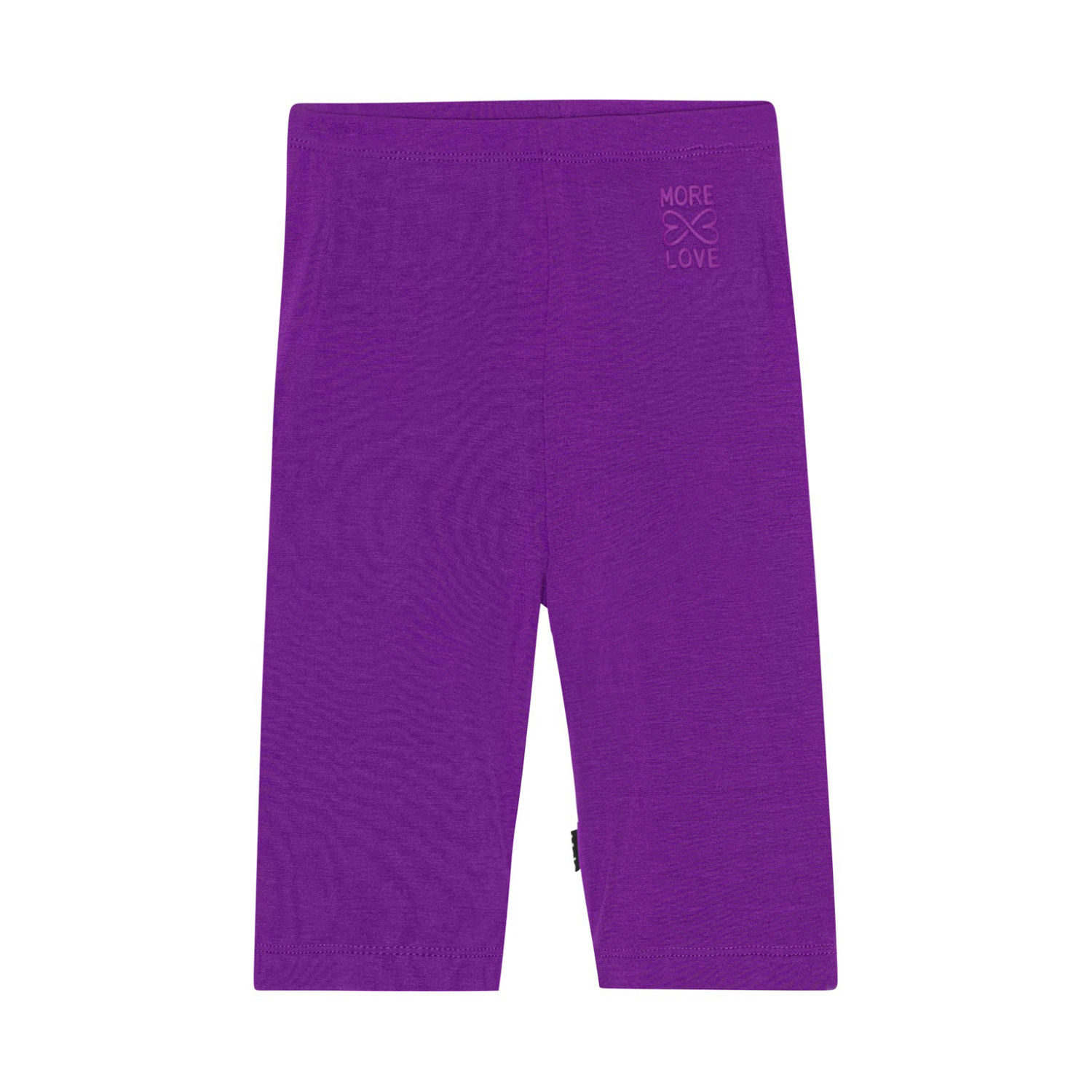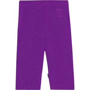 Purple bike shorts in soft, elastic viscose. The shorts are knee length and have an elastic waist and a small logo on the front with the text, 'More love'. They are snug fitting, comfortable and easy to pull on and off.