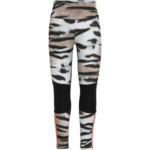 Olympia is a pair of sports leggings in a cool tiger print with black knees and a wide elastic waist. These leggings ensure perfect comfort and flexibility, while allowing for full, unrestricted movement. Olympia is a part of Molo's new sports collection, which seamlessly unites fashion and sports. Wear the Olympia leggings with one of Molo's tops for a complete, sporty look. Molo’s sports collection is made with a unique, high-performance technology called HeiQ Smart Temp, which supports the body’s natural ability to cool itself down. The cooling function is activated when you are warm and sweating. The cooling function becomes deactivated when the body has cooled down. HeiQ Smart Temp ensures optimal performance and comfort. Independently tested for skin safety.
