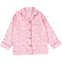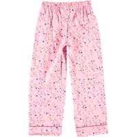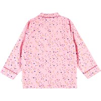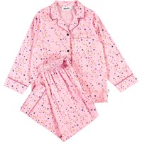 Two-part pyjamas in pink with a coloured star print. The trousers have ties at the waist, and the top has long sleeves. The nightwear set comes in a delicate bag.