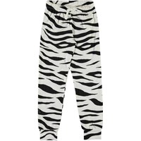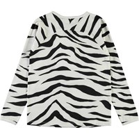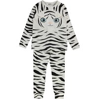 Two part nightwear set in white with tiger stripes with eyes and ears on the top. The bottoms have ties at the waist, and the top has long sleeves.