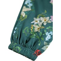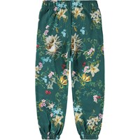 Green sweatpants made of organic cotton with an elastic waist, inner drawstring, elastic around the ankles and side pockets. The sweatpants have a regular fit and a beautiful floral print along the legs.