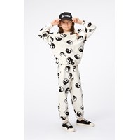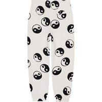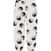 Off-white trousers in organic cotton with yin/yang symbols. The trousers have an elastic waist with an inner drawstring that gives them a good shape and makes the trousers easy to pull on. They have side pockets and elastic at the legs for a bit of fullness.