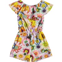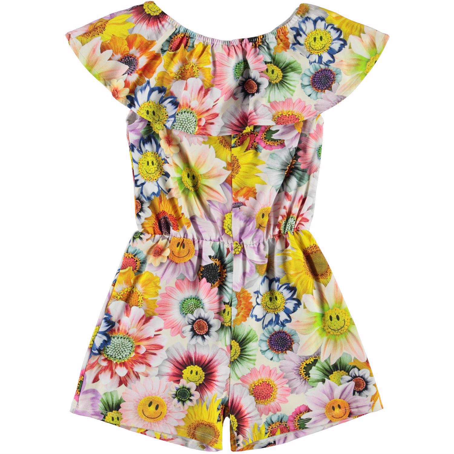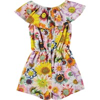 Adda is a sleeveless pantsuit with short legs. It is in a happy flower print. Adda has an elastic waist and a wide collar at the shoulders.