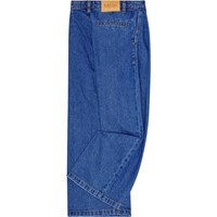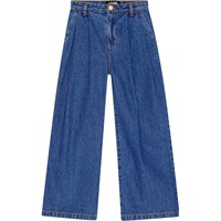 Wide denim blue jeans in soft cotton with front pockets, welted back pocket, and large pleat at the front for a boxy silhouette. Waist with belt loops, button and zip closure, and internal adjustable elastic for a comfortable fit.