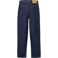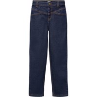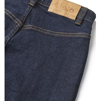 Dark blue denim jeans with copper-colored stitching made of organic cotton. These jeans have a regular fit, stitching on the front and two front pockets.