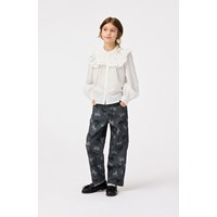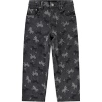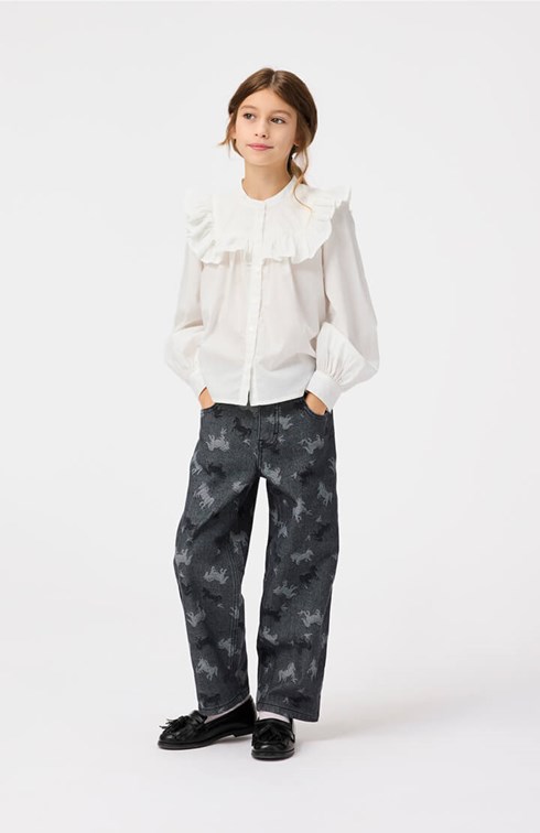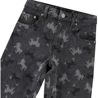 Dark grey jeans with a loose fit. These jeans have 5 pockets, straight legs, and a zip fly. Made from specially woven jacquard denim with black and grey horses. The waist of the jeans can be adjusted with an internal elastic, ensuring a perfect fit for all children. Sizes 92-134 have a snap button, making it easy to take the pants on and off, while sizes 140-176 have a regular jeans button.
