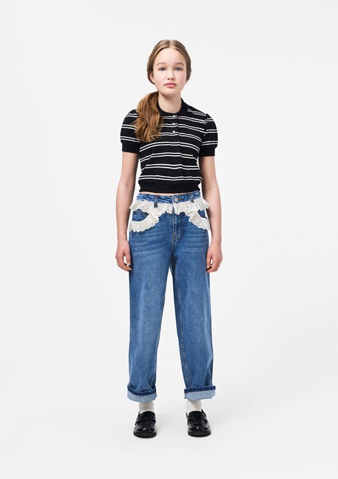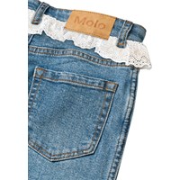 Blue jeans made of organic cotton denim with white lace detail. The jeans have 5 pockets, straight legs, a zip fly, and a loose fit with adjustable elastic at the waist. The smallest sizes (92–134) have a press stud, while sizes 140–176 have a classic jeans button.