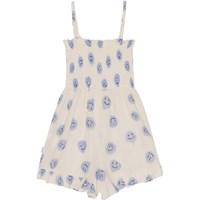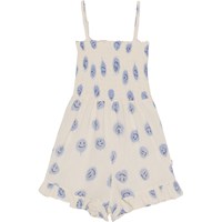 Alicia is a white jumpsuit, with adjustable straps and short legs, in 100% cotton mousseline. The top is smocked with elastic for a super comfortable fit, while the bottom of the shorts has ruffles for a fun and airy look. The jumpsuit is in the all over Crisp Smiles print with small, spray painted happy faces in blue.