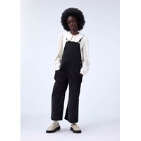 Black soft corduroy dungarees. The dungarees have adjustable braces, a small front pocket on the chest, sewn-on pockets on the side of the thigh and two snap buttons on the side that make them easy to put on. The dungarees have a waistband and wide legs.