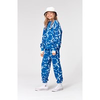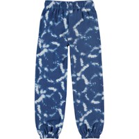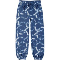 Ammosa is a pair of blue sweatpants with a white tie dye print. They have an elastic waist with pink ties.