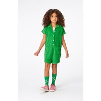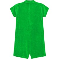 Green, short jumpsuit in soft cotton terry. It has a classic collar, patch pockets on the front and a button front closure with mother of pearl coloured buttons. Cotton terry is comfortable and dries quickly after a swim.